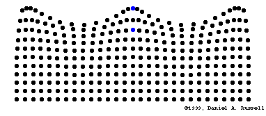 Another example of waves with both longitudinal and transverse motion may be found in solids as Rayleigh surface waves. The particles in a solid, through which a Rayleigh surface wave passes, move in elliptical paths, with the major axis of the ellipse perpendicular to the surface of the solid. As the depth into the solid increases the "width" of the elliptical path decreases. Rayleigh waves are different from water waves in one important way. In a water wave all particles travel in clockwise circles. However, in a Rayleigh surface wave, particles at the surface trace out a counter-clockwise ellipse, while particles at a depth of more than 1/5th of a wavelength trace out clockwise ellispes. The movie below shows a Rayleigh wave travelling from left to right along the surface of a solid. I have identified two particles in blue to illustrate the counterclockwise-clockwise motion as a function of depth.