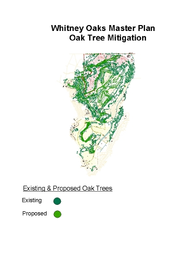 As land developments get larger and the logistics of maintaining thousands of trees becomes overwhelming, a solution must be found to gather and store data in a practical and efficient manner. In the case of Whitney Oaks, the oak tree mitigation requirements involve the planting and maintenance of over 3,500 oak trees. The developers asked their landscape architecture firm to develop a system that would allow them to monitor the trees as required. A combination of current software and technology such as GIS, AutoCAD, and Access were used to create maps and a database that will allow the developer to successfully meet the oak tree mitigation requirements.