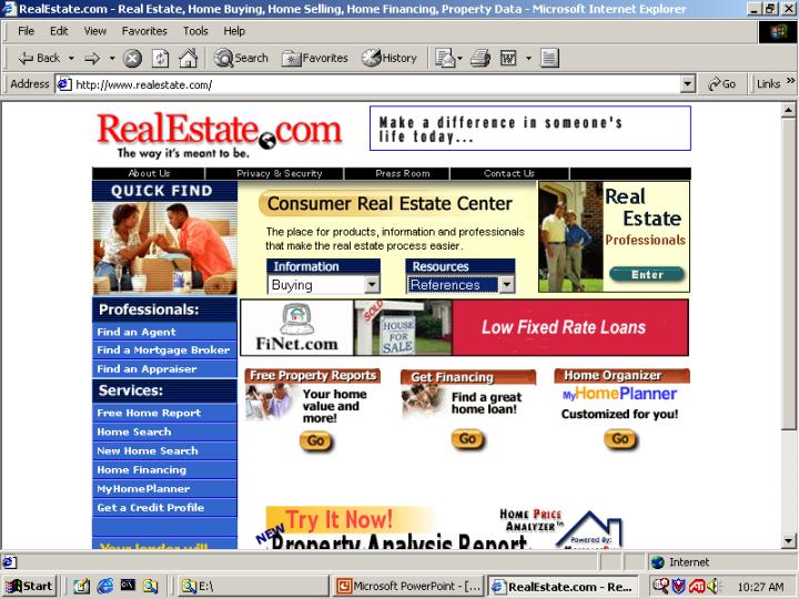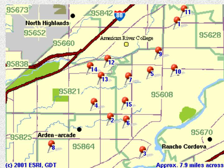 I began my DATA ACQUISITION Presentation as a GIS project using ArcView. I had already decided to use this opportunity to help me locate a home to buy in the Sacramento area. In this way, it would be practical and personal, kind of like “two birds with one stone”, so to say. I spent a good deal of time attempting to download various streets themes into ArcView, but with little luck. Some downloads would not project and others simply did not have the right format. My instructor and aide, Paul Veisze and Marsan Klein, explained to me that DATA ACQUISITION is not unique to GIS. However data can be captured, organized, summarized and presented to the audience, is DATA ACQUISITION. At this point my approach was to simplify my project and use the tools available – my own laptop and the Internet. I titled my project “Finding a Home (through the Internet)” because that’s exactly what I was going to do for my class presentation and myself!