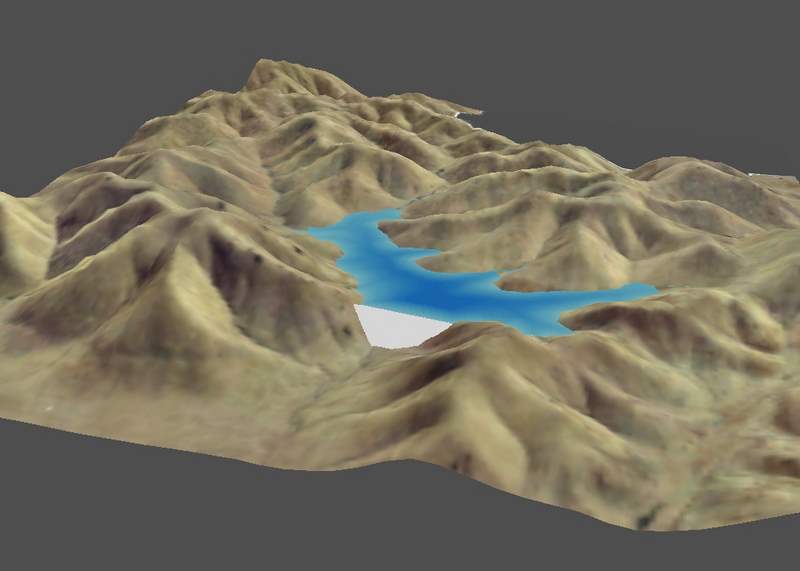 After bringing all the data into ArcScene, I displayed the layers in a way which resulted in a fairly realistic representation of the proposed dam and reservoir. The aerial photo was draped over the base heights (with a Z Value exaggeration of 1.5) from the elevation grid I created, and the reservoir boundary was used show water in the reservoir.