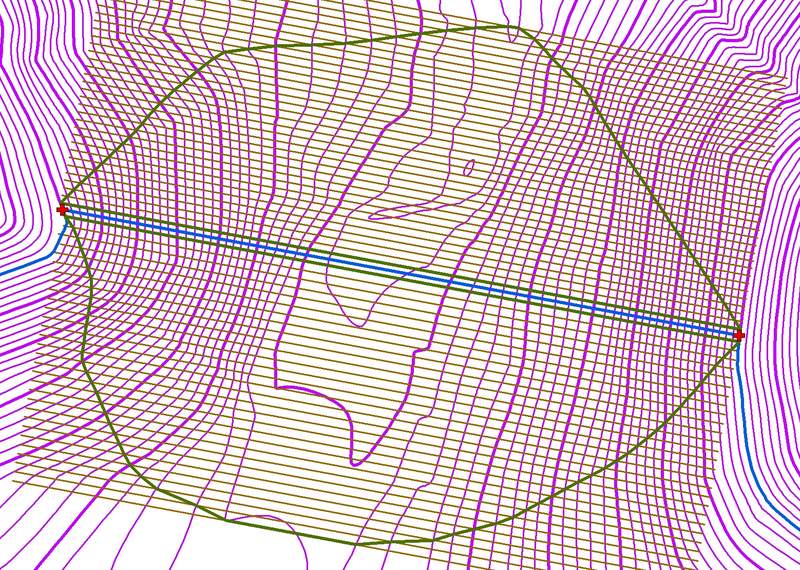 The first piece of data required was a shapefile of the dam alignment. This was easy - The left and right GPS points were connected and the line extended all the way to the 810 foot contour.