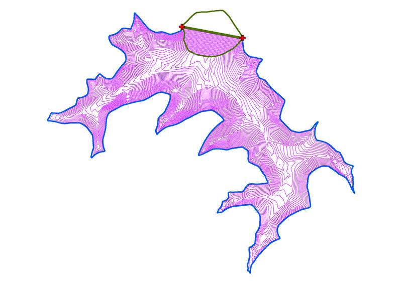 Reservoir Contour Lines The contour lines were clipped to the extent of the reservoir and edited to reflect the shape of the dam. This was done by connecting the contour lines where they intersected the dam's footprint, to model the slope of the dam.