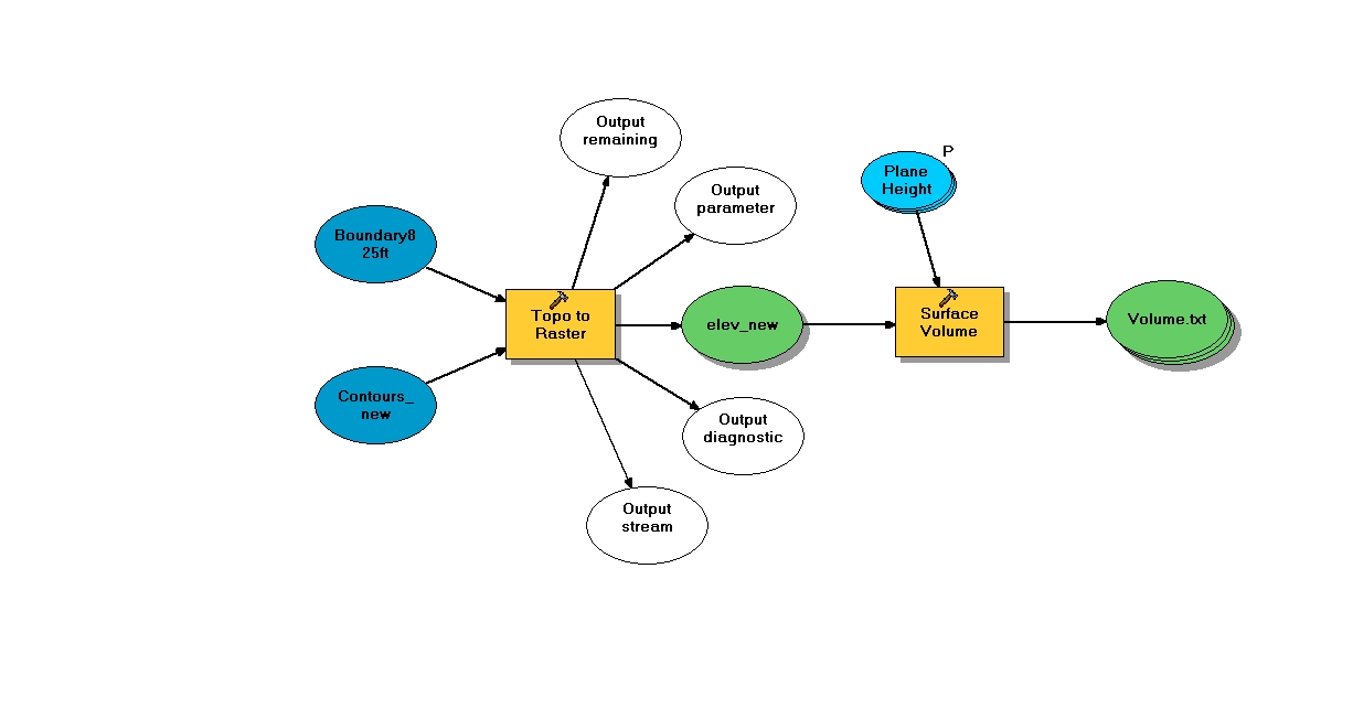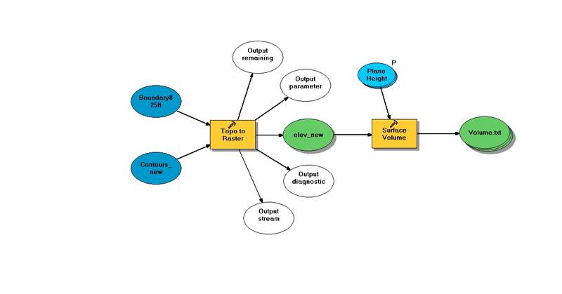Model Builder came in very handy. After my initial volume calculations, I was asked to perform this task again, as the crest elevation was going to change. The model I created allowed me to run the same processes over again with new imputs very easily.